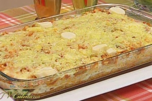 - Em um recipiente distribua em camadas o molho, arroz cozido, fatias de presunto, molho, fatias de mussarela, arroz, molho. Polvilhe queijo ralado.
